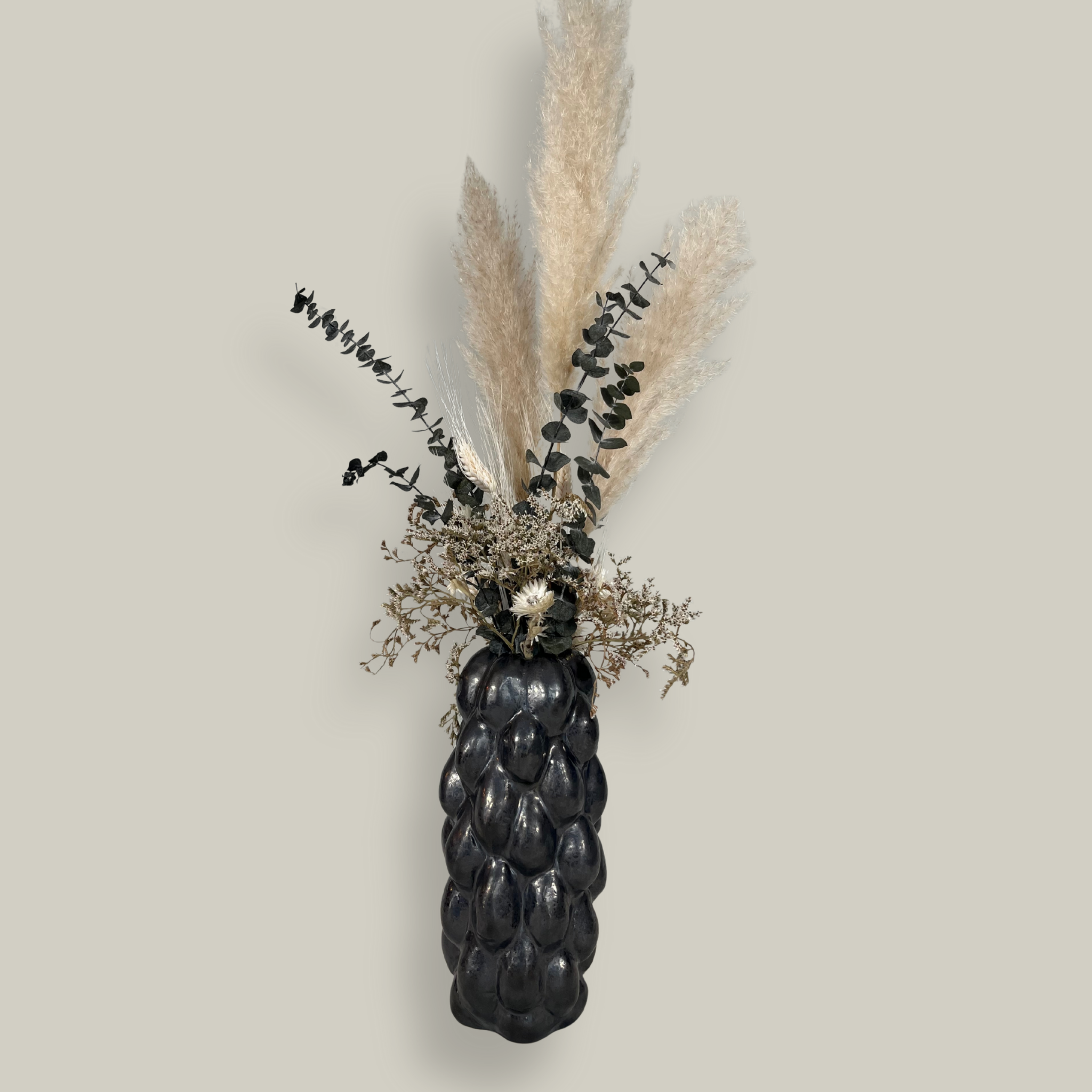 From this distinctive vessel, a magnificent composition of textures and tones rises. The soft, elegant plumes of natural Pampas Grass reach gracefully upward, complemented by the bold, preserved forms of blue Eucalyptus and the airy lightness of German Statice (sea lavender). The delicate whimsy of bleached Triticum (wheat) wisps adds a touch of rustic charm, while soft white Cape Flowers provide subtle pops of pure, natural color.