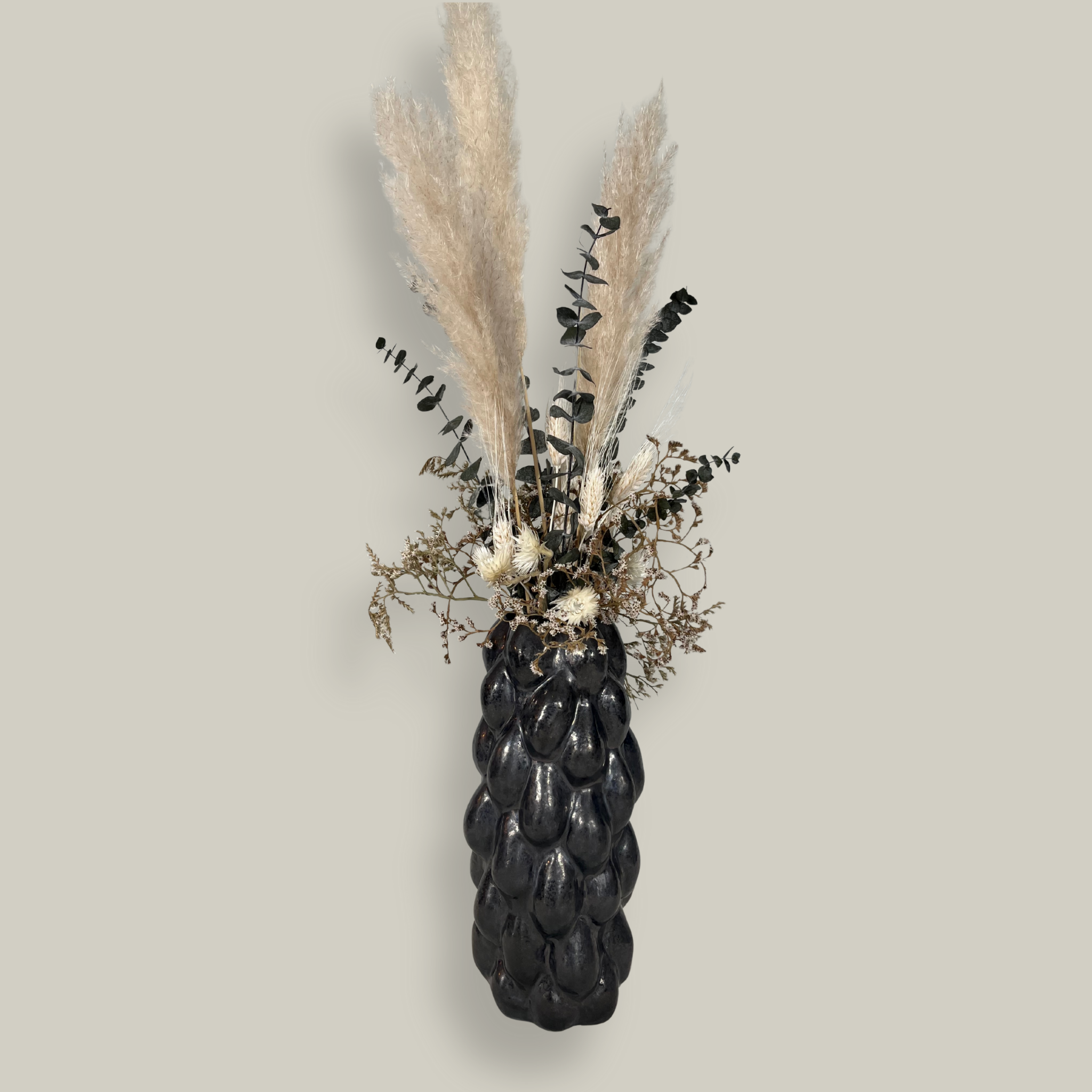 This magnificent, towering arrangement is a piece of living art, blending soft, natural textures with a bold, modern vessel to create a striking and enduring focal point over three feet tall.