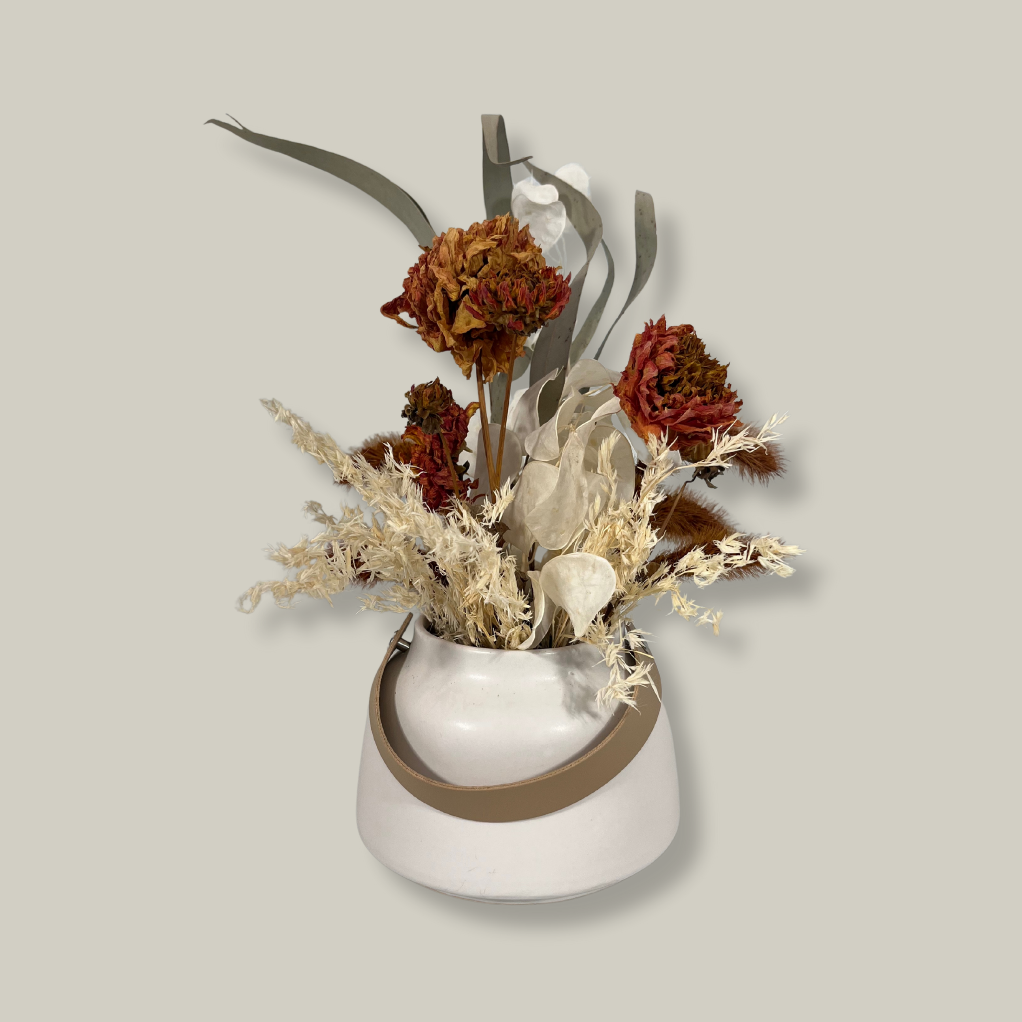 • Vessel: Matte White Ceramic Tapered Vase (3.5" tall) with Faux Leather Handle